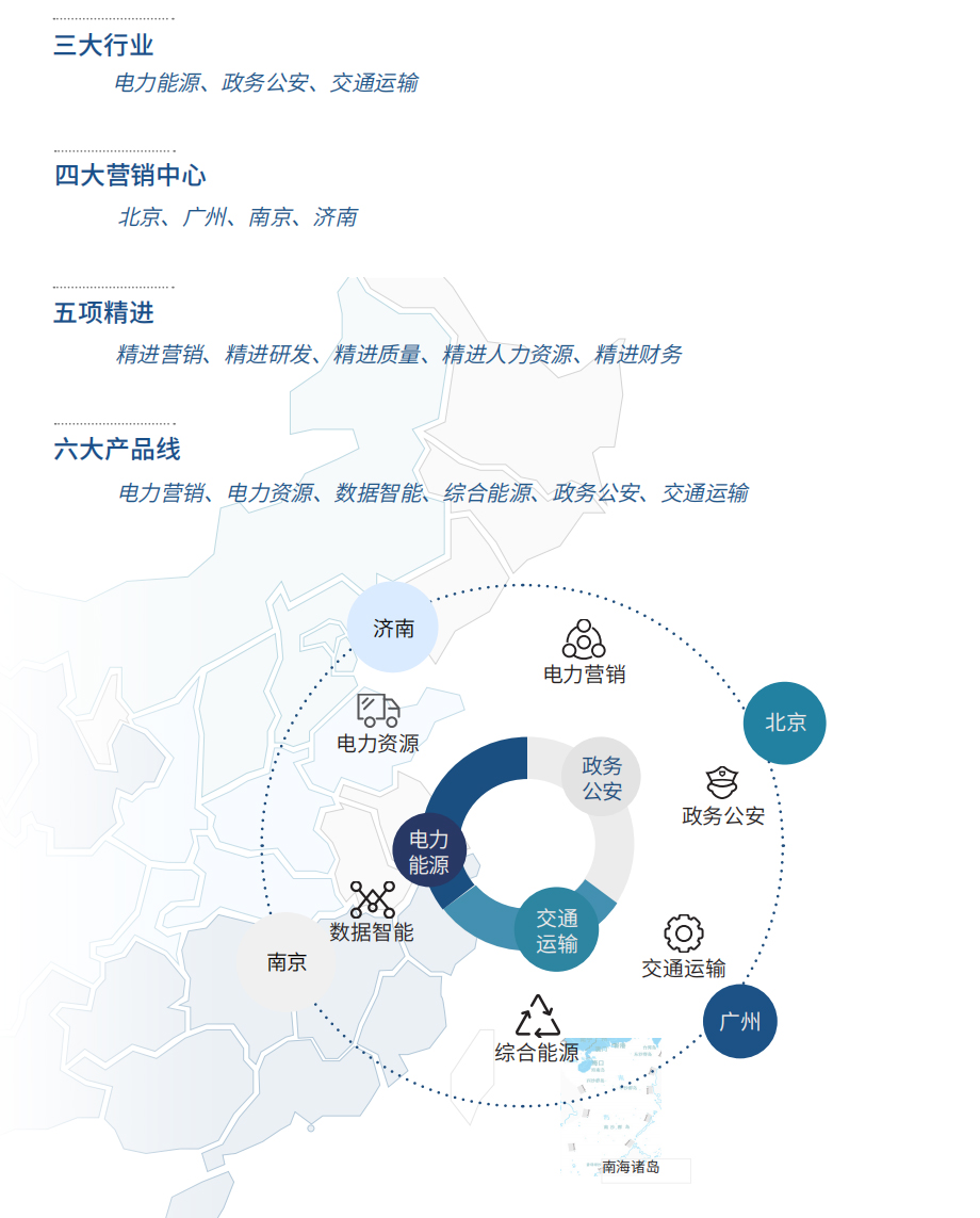 ¹«Ë¾¾Û½¹µçÁ¦ÄÜÔ´¡¢ÕþÎñ¹«°²ºÍ½»Í¨ÔËÊäÈý´óÐÐÒµ£¬ÒÔ±±¾©¡¢¹ãÖÝ¡¢ÄϾ©ºÍ¼ÃÄÏΪÖÐÐÄ£¬¹¹½¨¸²¸ÇÈ«¹úµÄÊг¡ÓªÏú¼°·þÎñÍøÂ磬ÒÀ¸½·á˶µÄ²úƷϵͳ¡¢¾«½øµÄ´´ÐÂÑз¢ÏµÍ³¡¢¸ßЧµÄ·þÎñϵͳ¡¢¿¿µÃסµÄÖÊÁ¿ÖÎÀíϵͳ£¬´òÔìÃÀÂúµÄÐÐÒµ½â¾ö¹æ»®£¬ÎªÈ«¹ú800¶à¼Ò¿Í»§³ÖÐø½»¸¶ÓÅÖʵÄÊý×Ö»¯²úÆ·Óë·þÎñ¡£