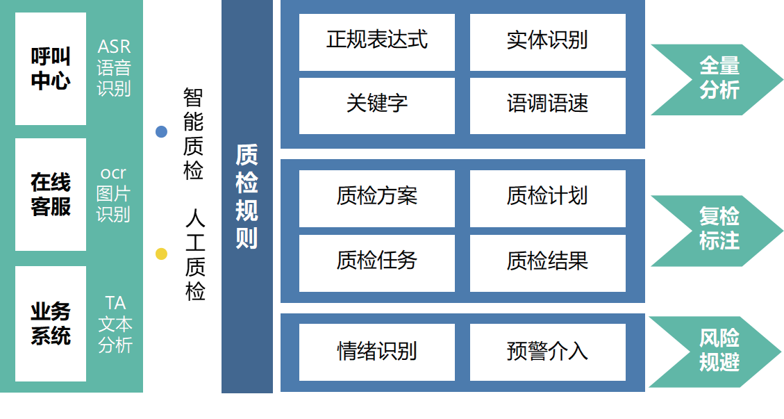 ½áºÏÕýÔò±í°×¡¢Îı¾·ÖÎö¡¢ÓïÒåÀí½âµÈ¼¼Êõ¹¹½¨ÐÐÒµ³õ´´µÄ¶àάÈںϵÄÖÊ¼ì¹æ¶¨£¬Ö§³Ö¹Ø¼ü´Ê¼ì²â¡¢¸ÐÇé¼ì²â¡¢Óï¿ìÒôÁ¿¼ì²â¡¢·þÎñÇÀ²å»°¼ì²â¡¢¿Í·þÏìÓ¦µÈ¹æ¶¨¡£