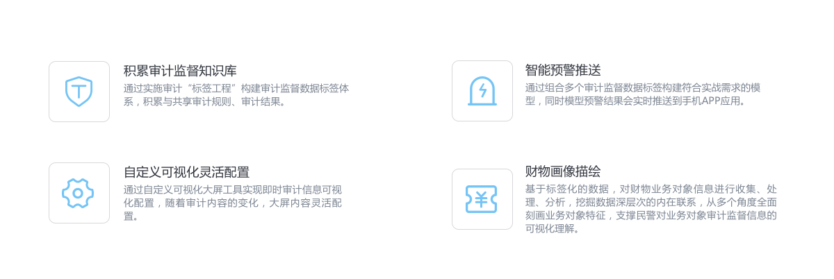 ÒÔ´óÊý¾Ý¼¼Êõ»ù´¡£¬“±êÇ©¹¤³Ì”˼ÏëΪÁìµ¼£¬½áºÏ¶ÔÉó¼Æ¼à¶½ÒµÎñ¼°Êý¾ÝµÄÉî¿ÌÀí½â£¬¹¹½¨ÁËÒ»Ì×Éó¼Æ¼à¶½Êý¾Ý±êǩϵͳ£¬ÊµÏÖÁ˶ÔÉó¼Æ¼à¶½ÒµÎñ¹æ¶¨µÄ“ÕûºÏ¡¢ÀûÓᢹ²Ï픣¬Í¬Õë¶ÔÉó¼Æ¼à¶½Ô¤¾¯ÐÅÏ¢ÌṩÁËÖÇÄÜ»¯ÍÆËÍ£¬ÎªÉ󼯹ý³Ì¼õ¸ºÌṩÁËÓÐÁ¦Ö§³Ö¡£