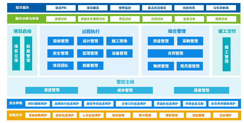 °´²ß¶¯ºÍ¾ö²ß¡¢Á¢Ïî³ï±¸¡¢ÏîĿִÐе½¿¢¹¤½»¸¶Ëĸö½×¶Î¶Ô¹¤³ÌÏîÄ¿½øÐÐÈ«¹ý³ÌÖÎÀí£¬ÊµÏÖ¶ÔÏîÄ¿¸ÅÔ¤Ëã¡¢½ø¶È¡¢Îï×Ê¡¢ÖÊÁ¿¡¢ºÏͬ¡¢³É±¾¡¢·Ö°ü¡¢»úеÉ豸¡¢ÎĵµµÈÒµÎñµÄÈ«¸²¸ÇºÍÈ«¹Ü¿Ø£¬²¢Í¨¹ý¶Ô¸÷»·½ÚµÄ×ÊÔ´ÕûºÏ£¬ÊµÏÖÒµÎñÁ÷¡¢ÐÅÏ¢Á÷¡¢×ʽðÁ÷¡¢ÎïÁ÷¡¢½ÚÔìÁ÷µÄͳһ¡£
